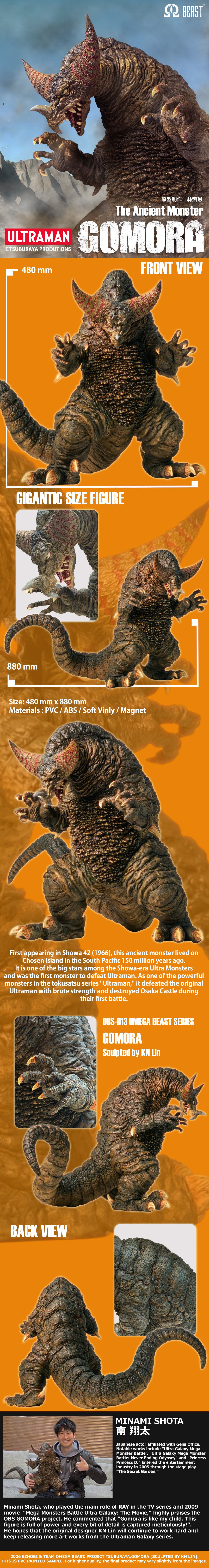 The wait is over. EZHobi is thrilled to unveil their first Ultra Monster in their Omega Beast lineup: Gomora! Gomora is an ancient, subterranean dinosaur-like kaiju known as the "Prince of Monsters," famously debuting as the first creature to defeat Ultraman in battle. Recognized by his massive crescent-shaped head crest and powerful "Mega-Ton Tail," he is often depicted as a tragic figure relocated from his prehistoric island home. While originally a fierce antagonist, later incarnations have portrayed him as a heroic ally and a symbol of raw, earth-shaking power.